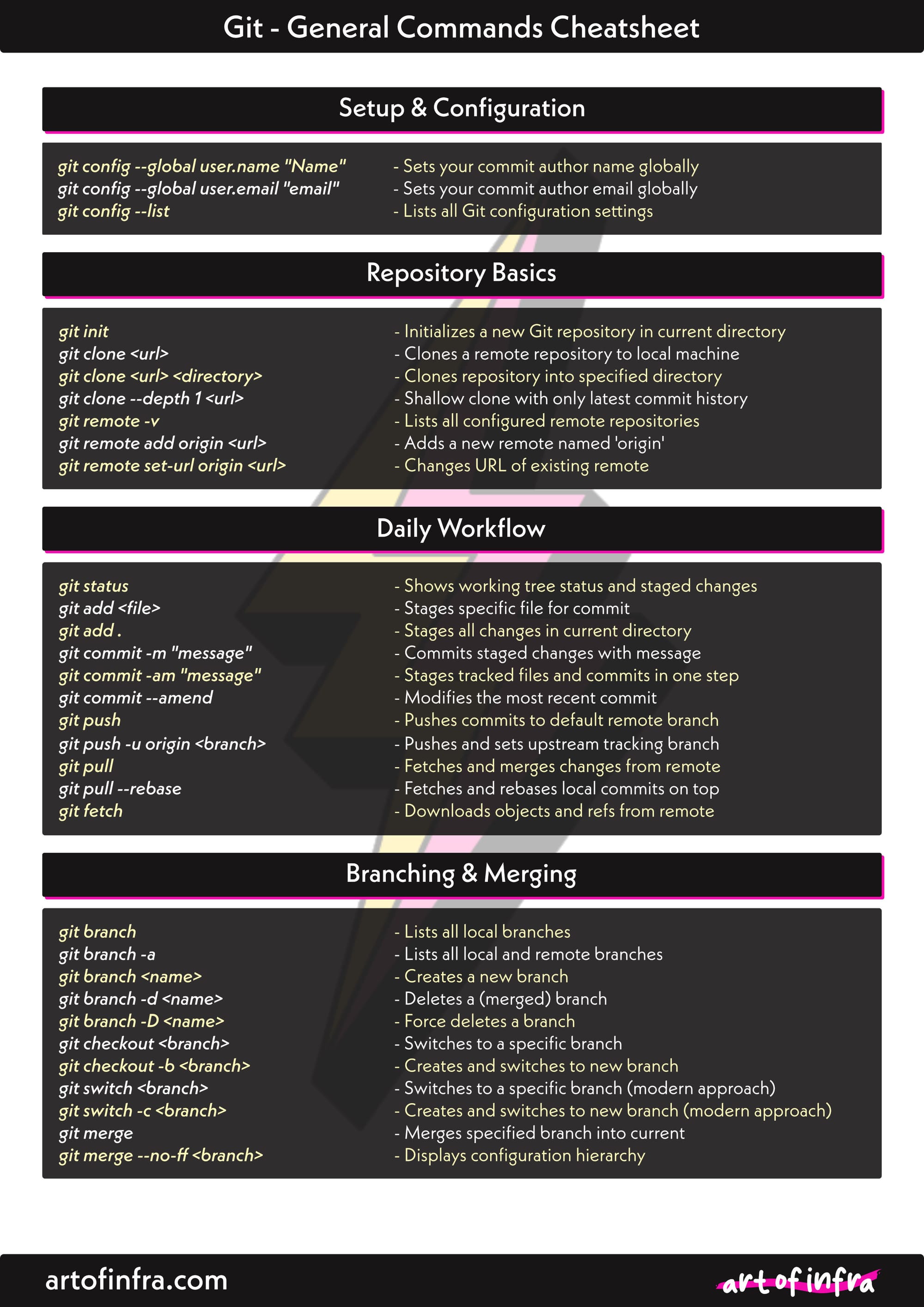 Below, you'll find the commands in code-blocks, a nifty PDF cheat guide, and some images that you can print off to hang on your wall and show off to all your friends/ gits! (if that's your thing)